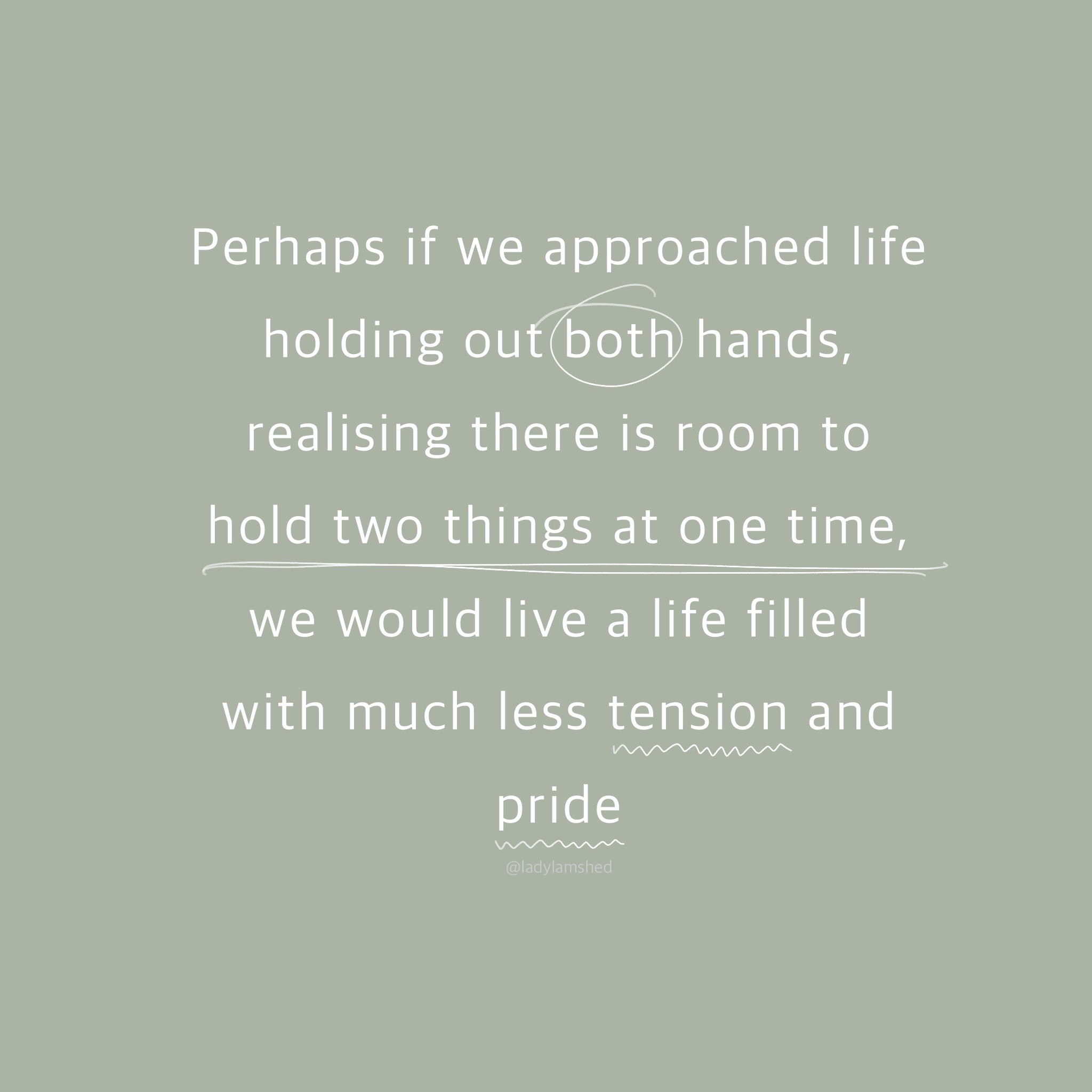 Perhaps if we went through life holding out both hands, realizing there is room to hold two things at one time, we would live a life filled with much less tension and pride.